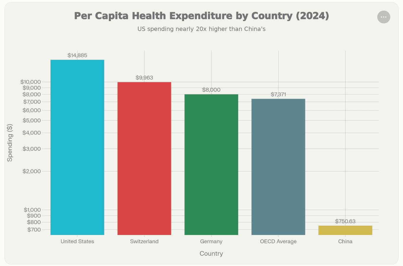 Western healthcare systems, such as that of the United States, operate at fundamentally different cost levels than China. The U.S. spends approximately $14,885 per capita annually on healthcare—nearly 20 times what China spends at approximately $751 per capita. Even Switzerland, the second-most expensive OECD country, spends only $9,963 per capita, while the OECD average (excluding the U.S.) stands at $7,371. This massive cost gap exists despite the U.S. producing worse long-term health outcomes than comparable wealthy nations.