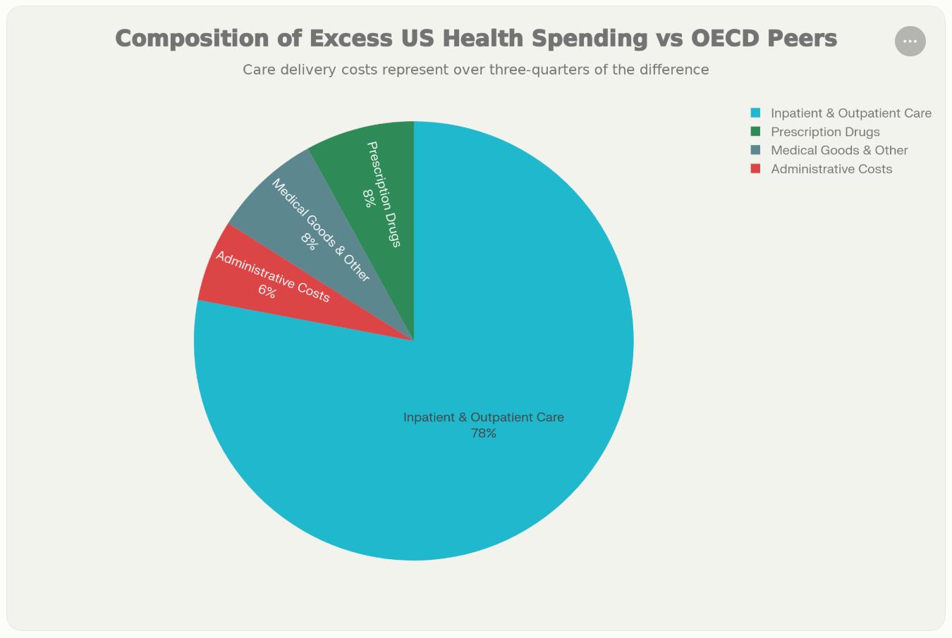 The largest driver of elevated Western healthcare spending is the price of clinical services themselves. Approximately 78% of excess U.S. spending compared to OECD peers comes from higher-priced inpatient and outpatient care services. Physician consultations in the U.S. cost roughly three times more than in other G7 countries, while specialist care is approximately twice as expensive. This reflects both higher physician compensation (U.S. GPs earn $218,000 annually versus significantly less in peer nations) and markup structures on hospital services.
