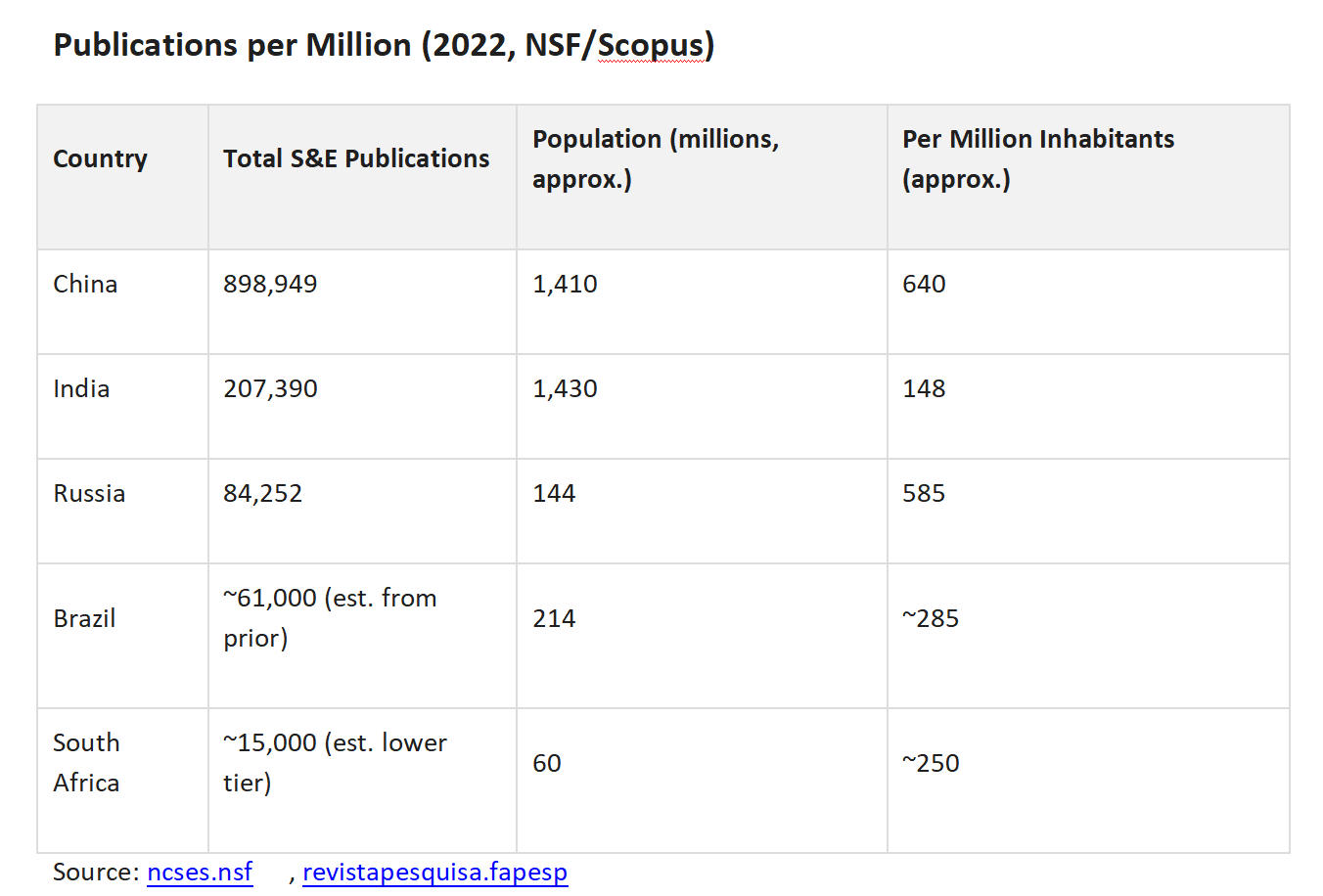 China also leads BRICS nations in both scientific publications and patent applications per million inhabitants based on the most recent available data, which covers 2023 for patents (WIPO 2025 report) and remains 2022 for publications (NSF 2023 report, with no newer comparable BRICS-wide figures found).