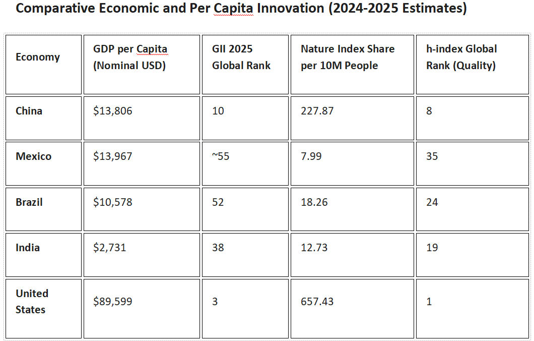 The divergence is most visible when analyzing per capita scientific output. While the United States leads in absolute terms for many metrics, China’s efficiency relative to its income is unprecedented. In fact, China's per capita research output surpasses that of most countries with similar GDP per capita, notably other large upper-middle-income economies like Brazil, Mexico, South Africa, and Türkiye. This conclusion is supported by multiple independent datasets and bibliometric studies.