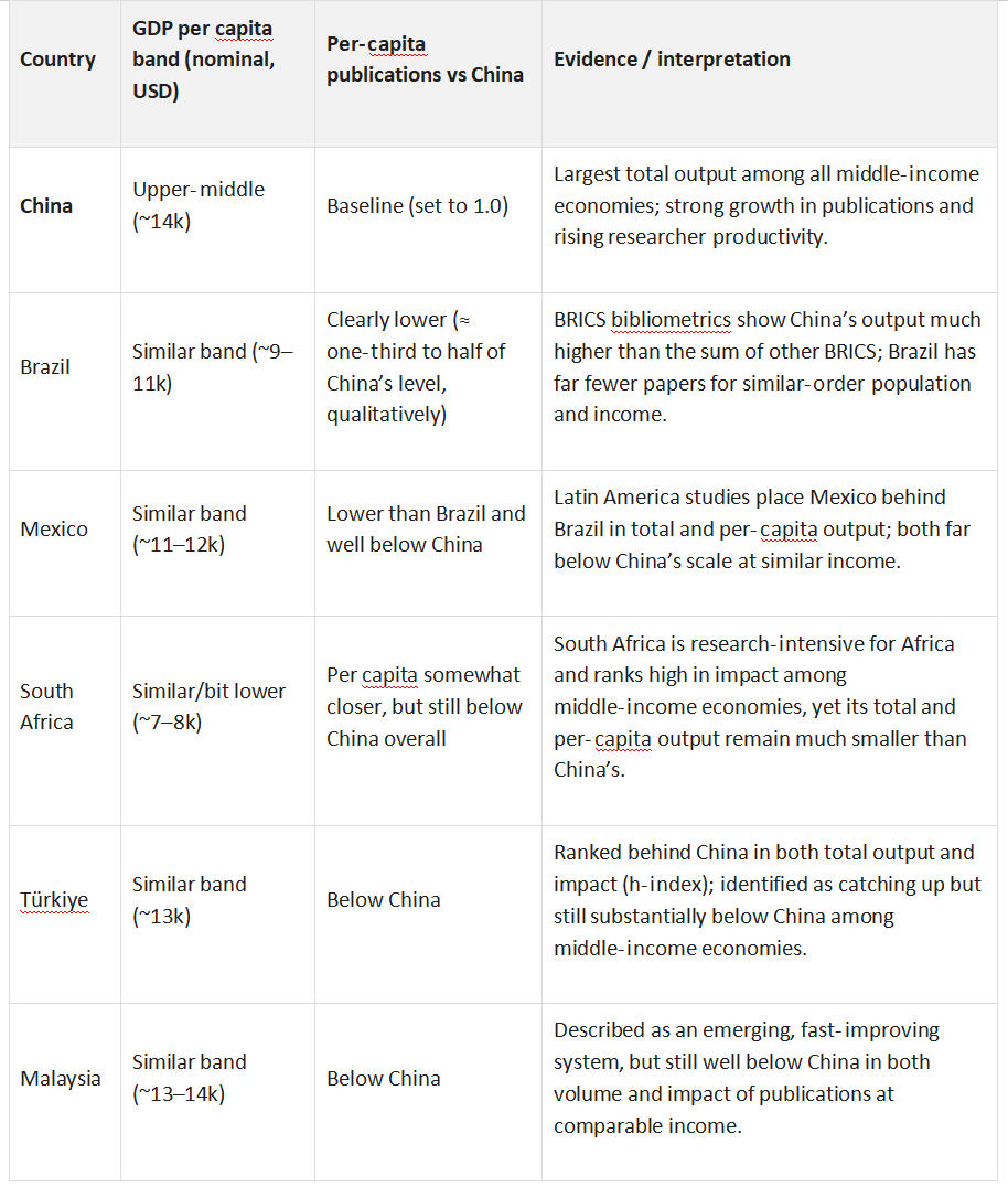 Impact-weighted indicators, such as the national h-index and field-weighted citation impact, position China as the leading middle-income nation, surpassing India, Brazil, South Africa, and Türkiye in both the quantity and citation impact of research outputs at comparable income levels. Comparative studies of economic development and scientific output within BRICS further emphasize that, when GDP and population are controlled, China emerges as an outlier with a markedly higher rate of scientific knowledge production than its BRICS peers.