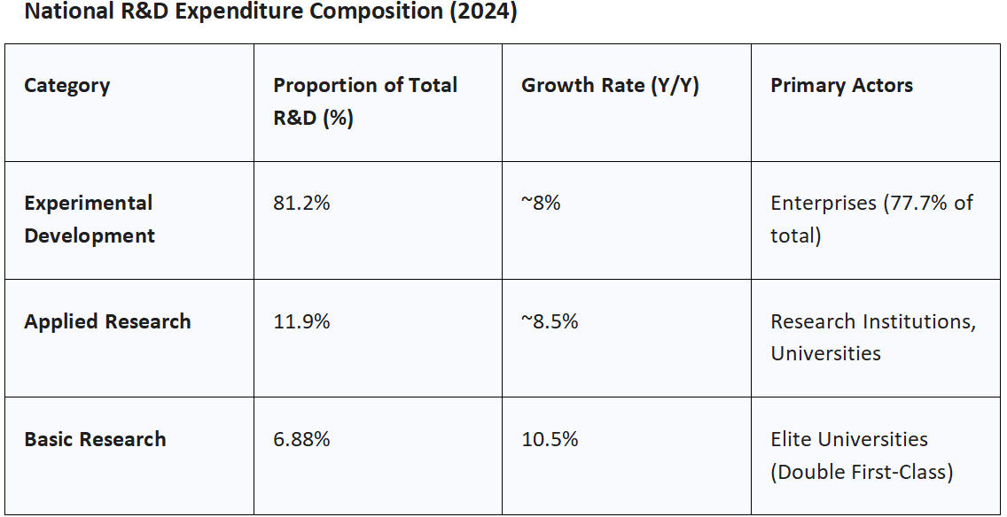 A granular analysis of China's R&D expenditure reveals a strategic preference for applied outcomes over basic research. In 2024, China’s total R&D spending reached 3.61 trillion yuan ($496.32 billion), an 8.3% increase over 2023. This expenditure represents 2.68% of China's GDP, which is rapidly approaching the OECD average of 2.73%. However, the internal allocation of these funds is highly skewed toward experimental development.