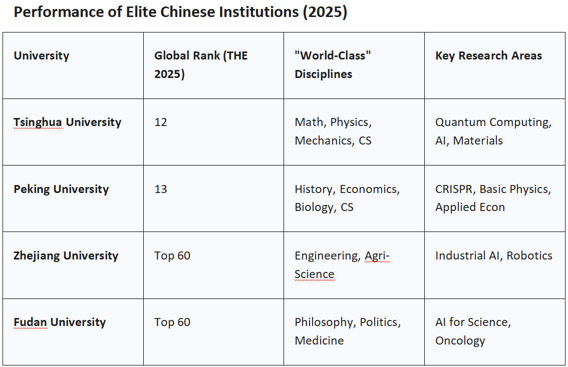 The initiative provides significant funding for research infrastructure and faculty development at universities like Tsinghua and Peking University, which now rank 12th and 13th globally in the Times Higher Education World University Rankings. Crucially, 9 of the world’s top 10 research institutions in 2025 are Chinese, with Harvard being the sole Western holdout in the elite tier.