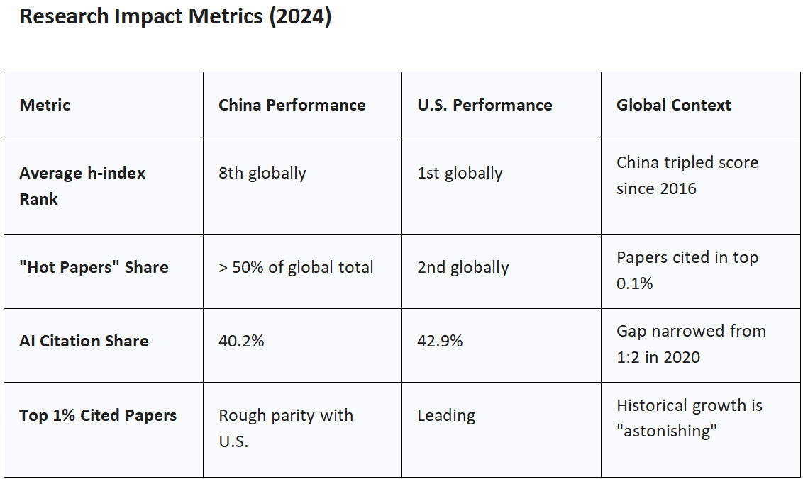 The impact of this pivot has been a "rout" of international competition in high-quality venues. China’s Nature Index output grew by 95% from 2020 to 2024, while the U.S. grew by only 9.5%. Furthermore, the average citation rate for Chinese papers—17.24 per paper—has exceeded the global average for two consecutive years as of 2024.